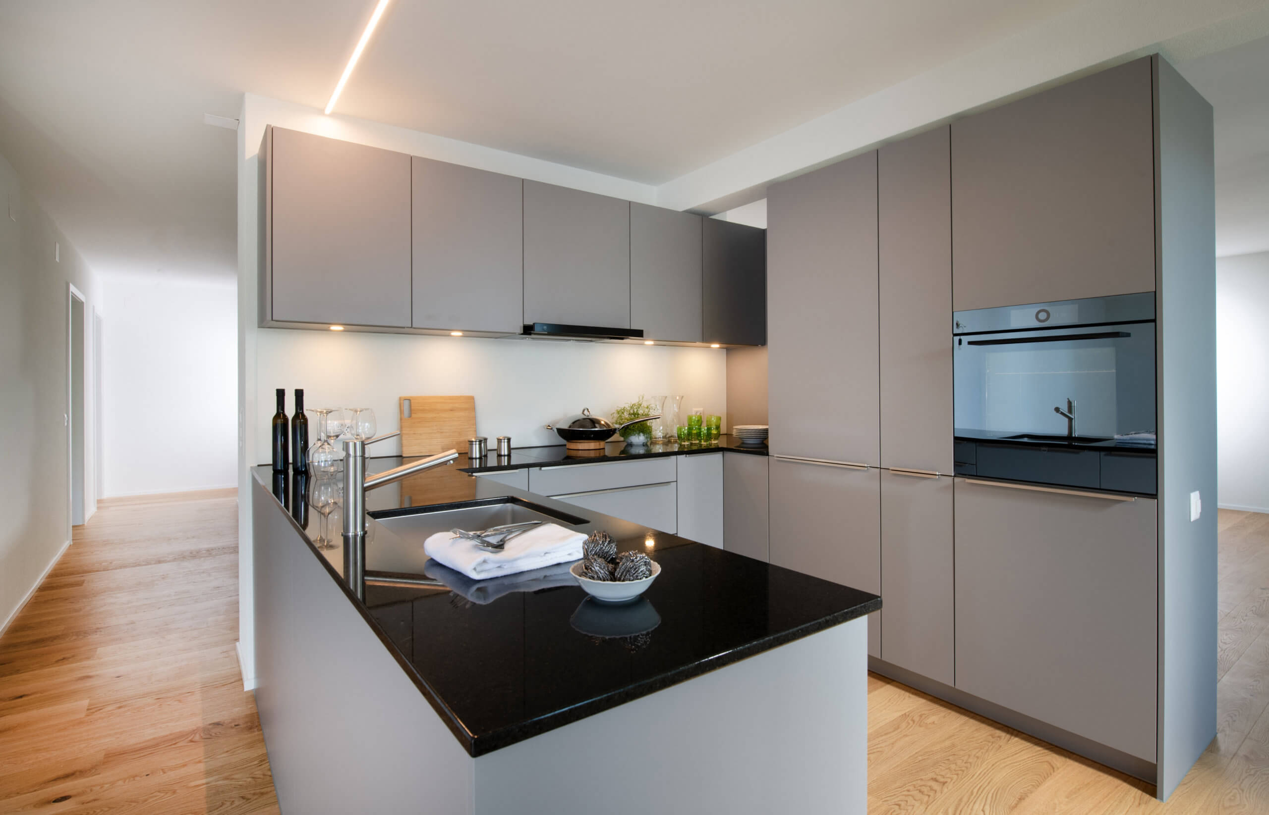Die Küche mit Seesicht bildet als Einschub die Mitte zwischen Wohn- und Essbereich. Schlicht im Front-Material in arktisgrau, polierter Granitabdeckung und Einbaugeräte in Spiegelglas, lässt sie Freiheit für die Möblierung in verschiedenen Stilrichtungen zu.