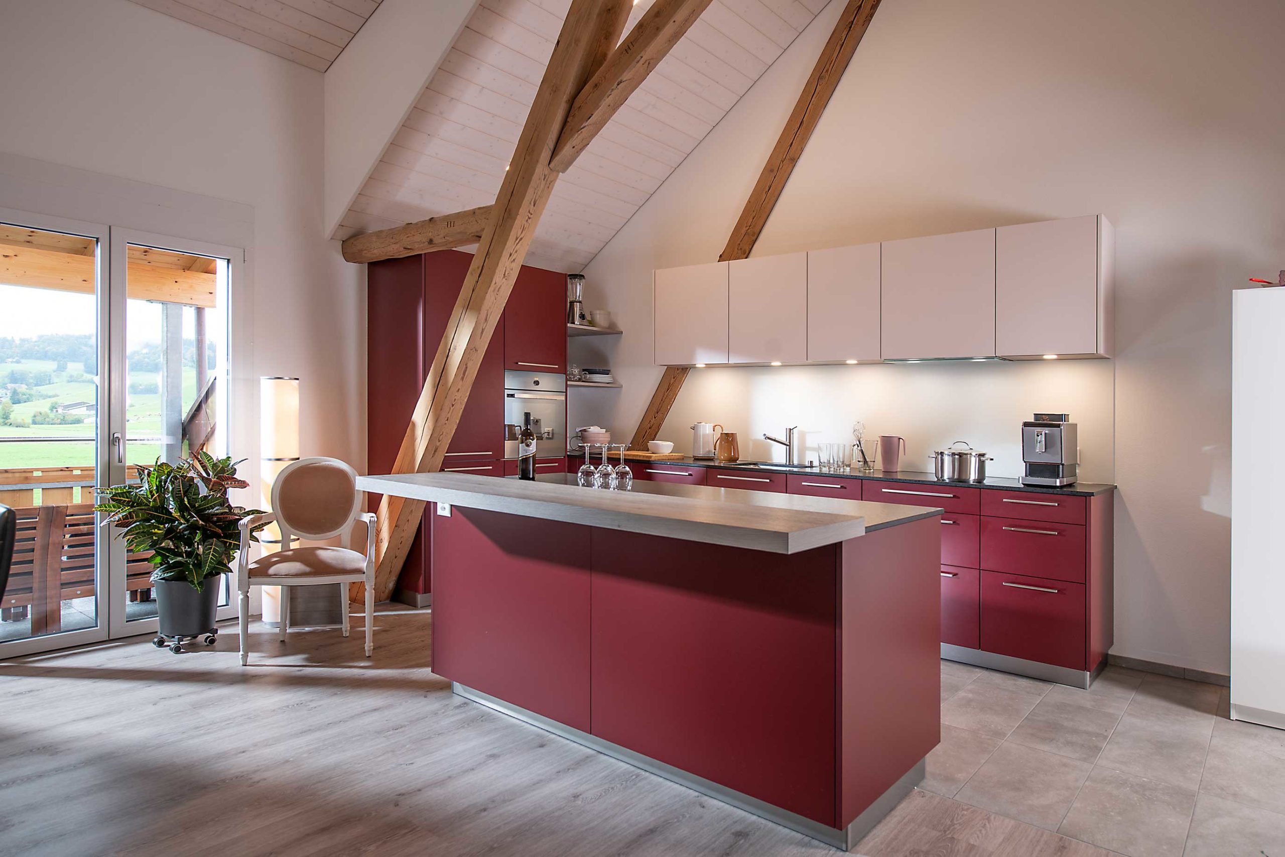 Das elegante Bordeauxrot lässt sich perfekt mit Weiss den hervorstehenden Holzbalken kombinieren.