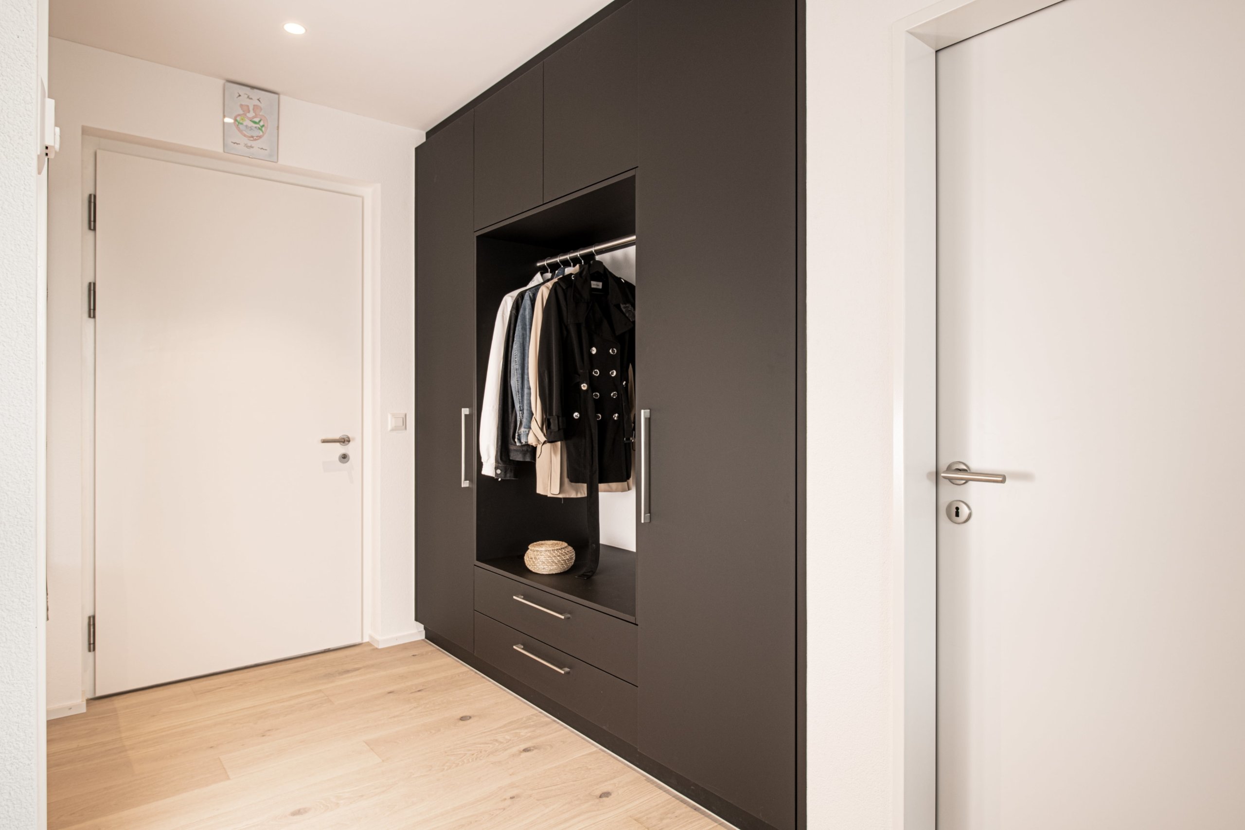 Passend zur Küche wurde die Einbaugarderobe konzipiert.