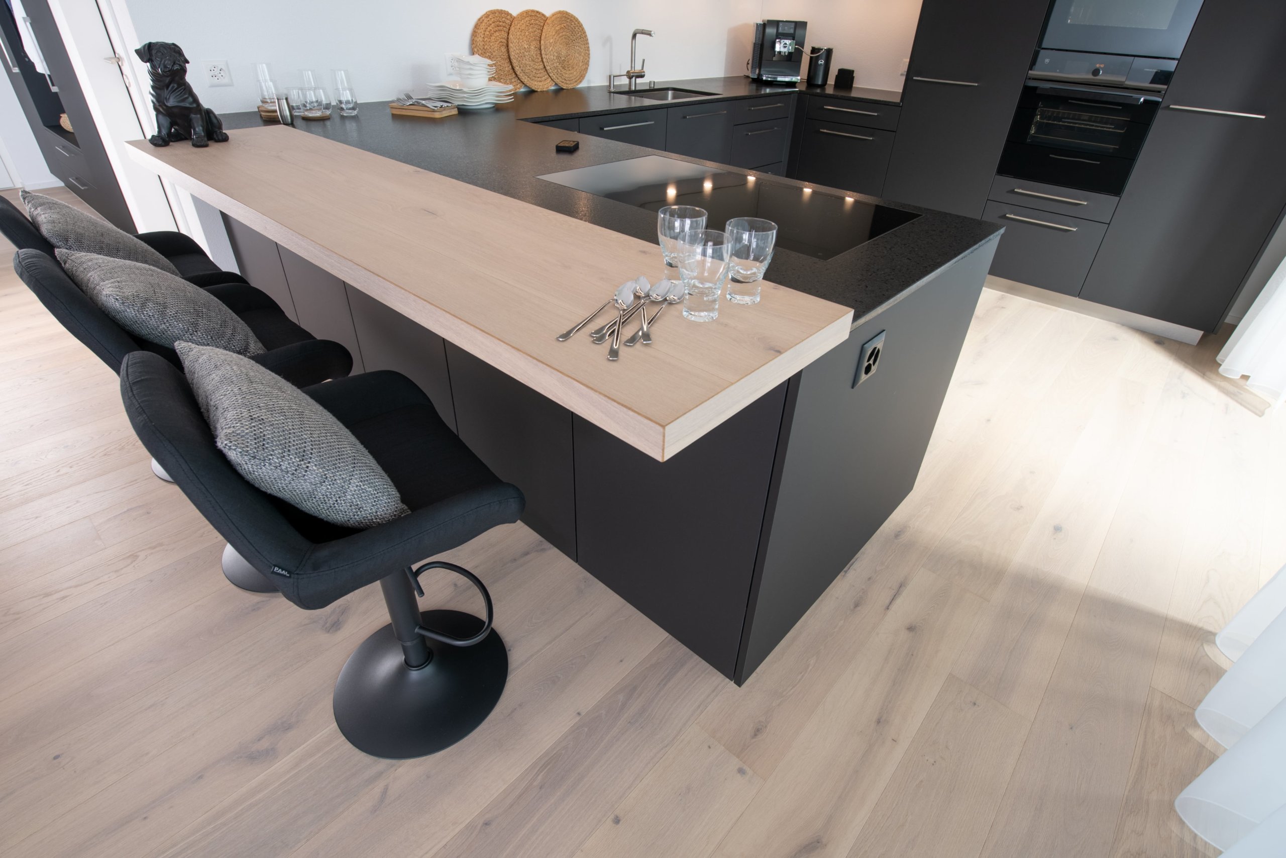 Die grosszügige U-Form der Einrichtung bietet viel Arbeitsfläche und natürlich Platz zum gemeinsamen Kochen. Die Bartheke wurde aus Parkett gefertigt, um exakt die gleiche Struktur und Farbe des Bodens aufzunehmen.