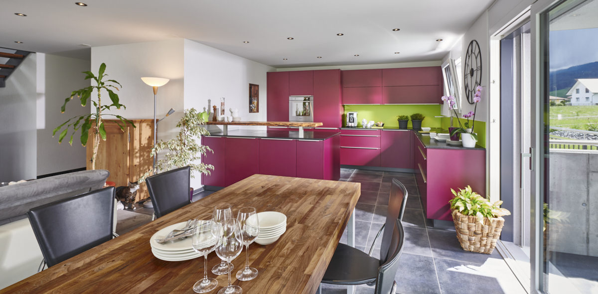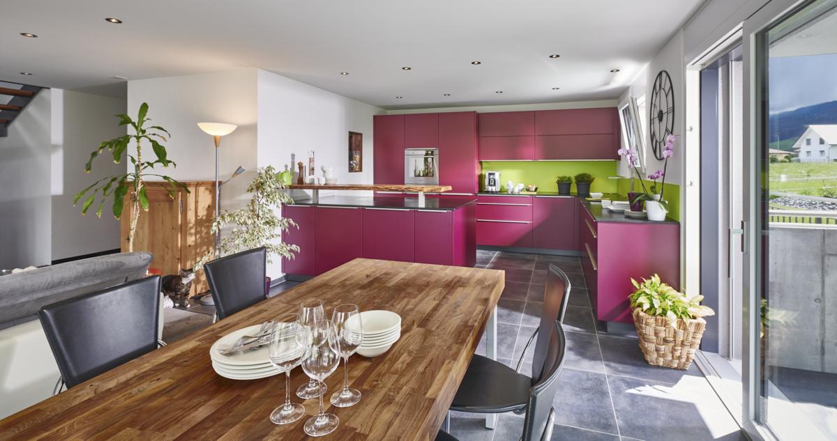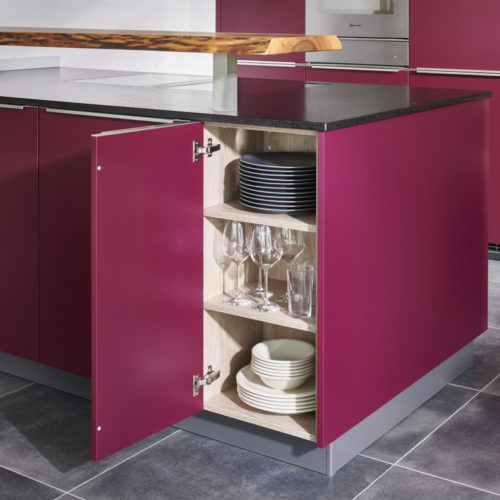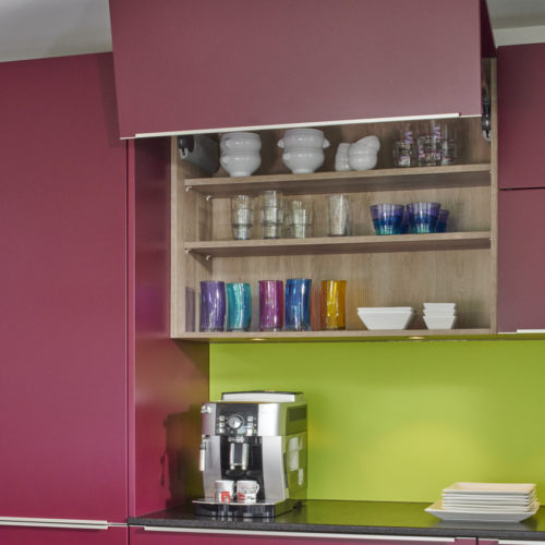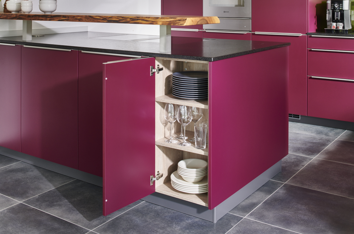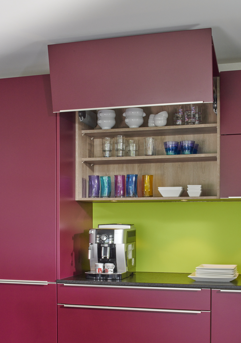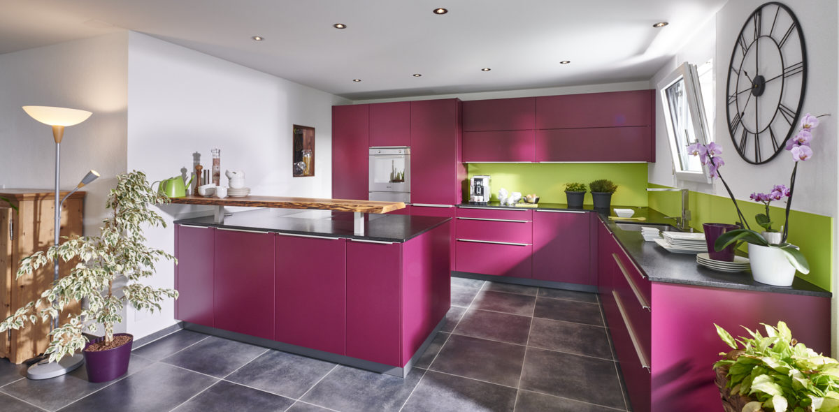 Durch die fantastische Farbkombination aus Individuell-Interieur grün und Framboise-Scandale ist die Küche ein echter Blickfänger. Es stehen Ihnen über 2000 Farbnuancen zur Auswahl für Ihre individuelle Kombination.