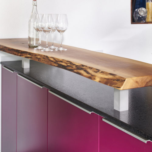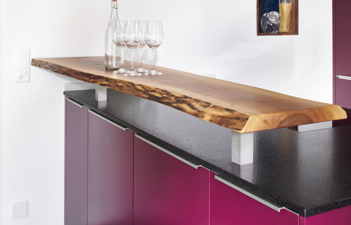 Die Barfläche mit naturbelassenen Kanten ist vom Bauherrn selbst passend zum Esszimmertisch hergestellt worden. Sie ergänzt wunderbar die kraftvolle Farbkombination.