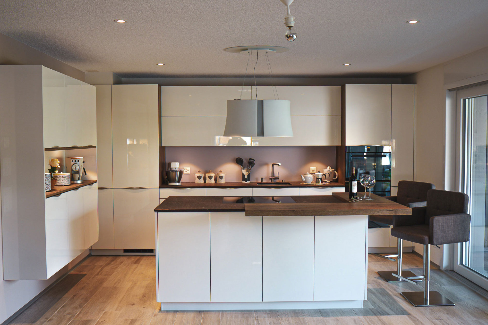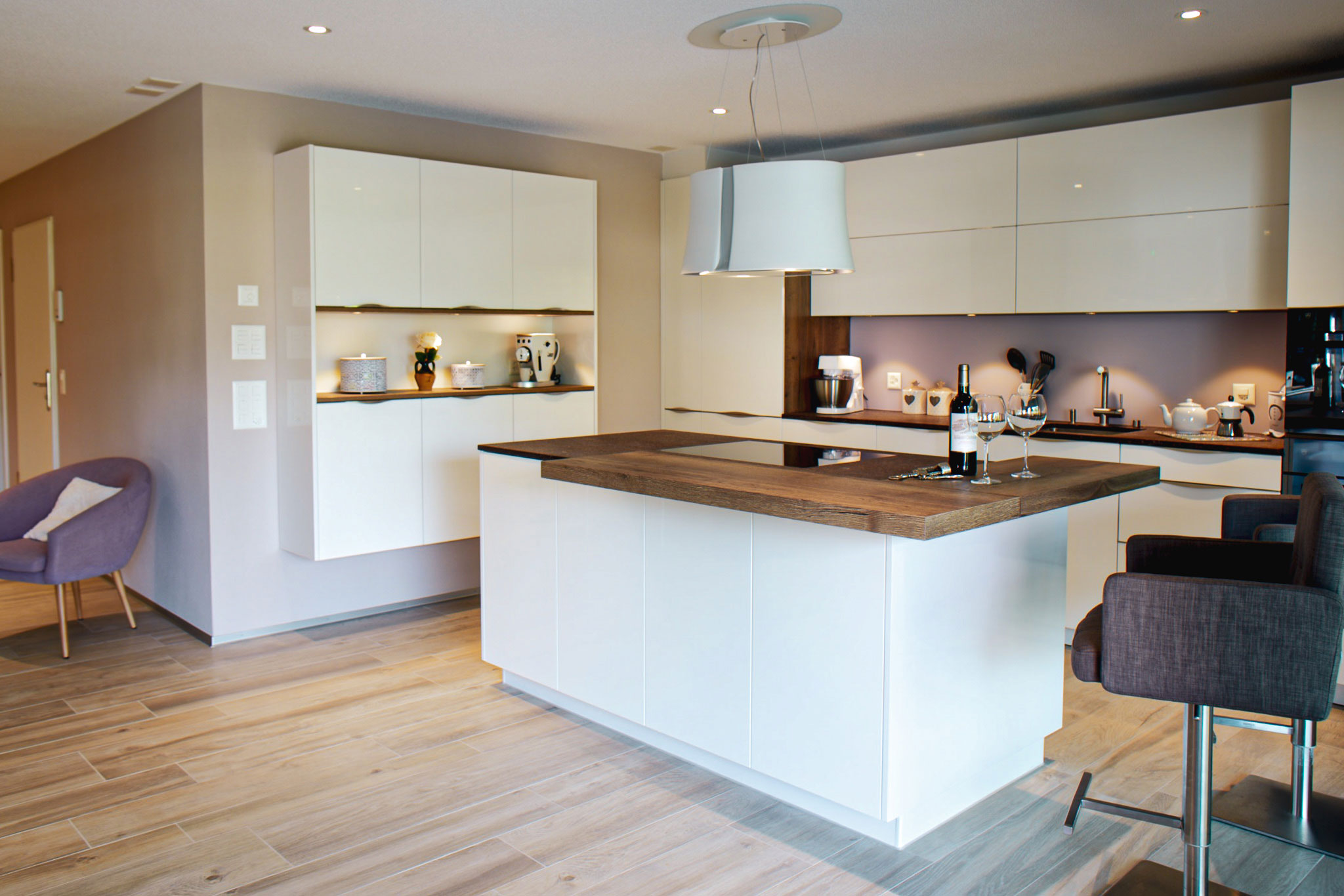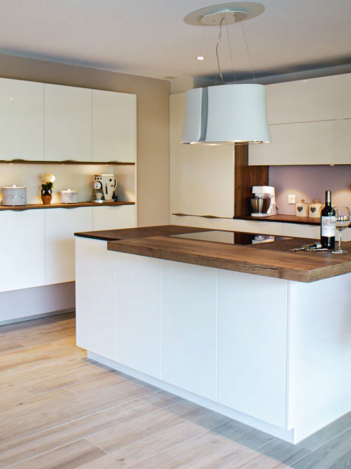 Hochglanz lackierte Front mit eingefrästem Metallgriff kombiniert mit rustikaler Eiche.