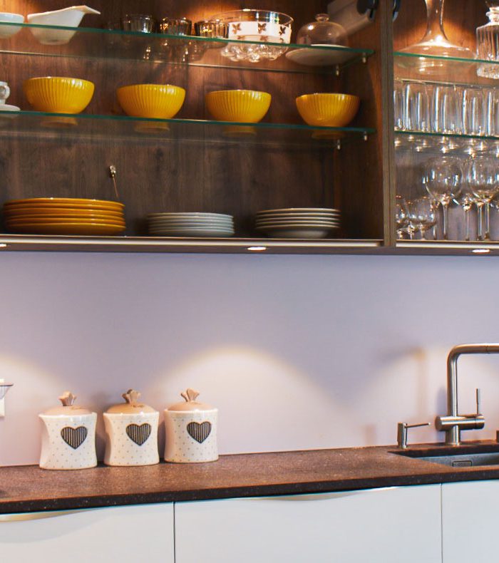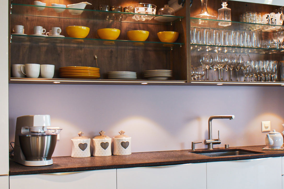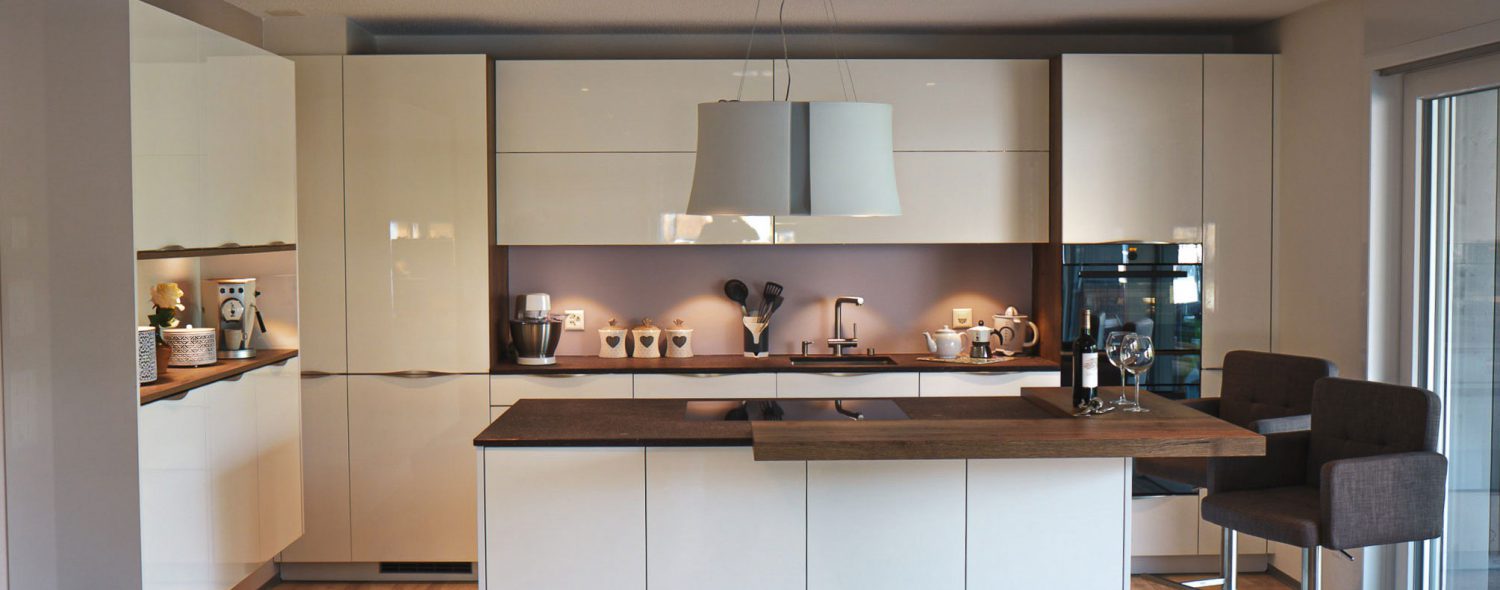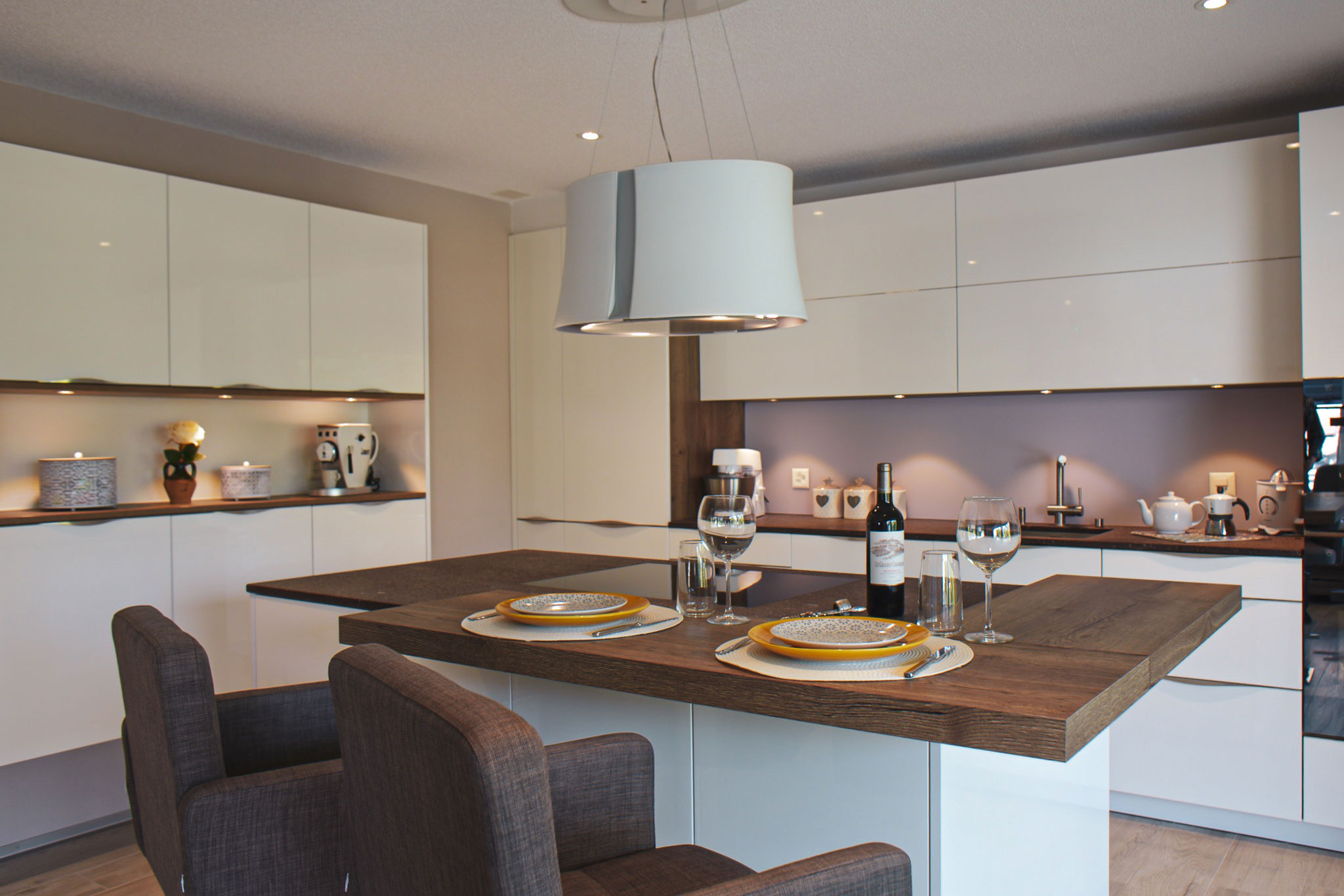 Hochglanz lackierte Front mit eingefrästem Metallgriff kombiniert mit rustikaler Eiche.