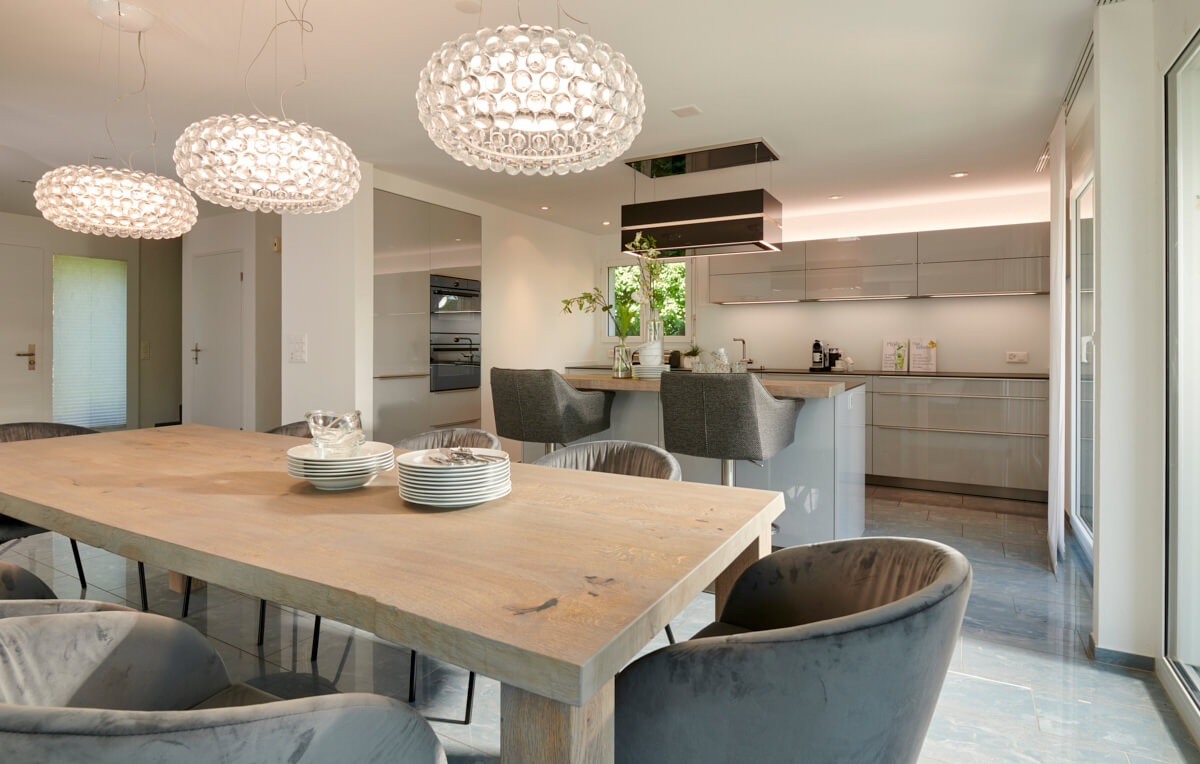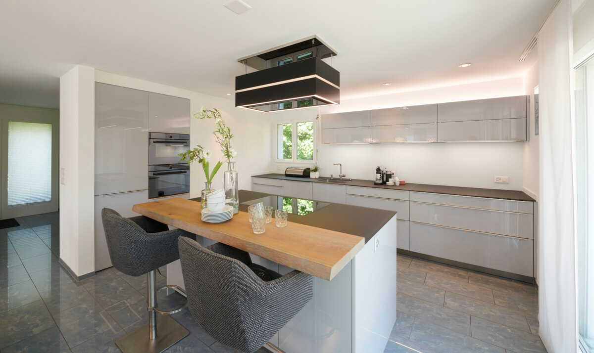 Diese Küchenkreation vereint stilvolle Elemente zu einem einzigartigen Zusammenspiel aus Kontrasten und Ästhetik. Die Fronttüren mit Glassschichtstoff-Oberfläche in Perlgrau Hochglanzlack mit Edelstahl Griffleisten verleihen der Küche einen modernen und edlen Look, während die Kochinsel mit einer Bartheke in Massiv Eiche Natur für eine warme und natürliche Ausstrahlung sorgt.