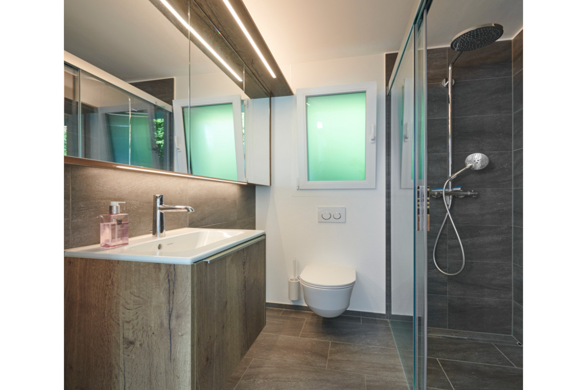 Das großzügige Badezimmer nebenan besteht aus faszinierender Front- und Innenmaterialausführung in Riss Eichen Graphit. Ein Spiegel sorgt für räumliche Weite und lässt das Badezimmer noch großzügiger wirken. Aber das Highlight ist zweifellos die große Dusche mit einer stilvollen Glasabtrennung und grauen Schieferplatten. Hier findet man Entspannung pur – ein Ort, an dem man sich rundum wohlfühlen kann.