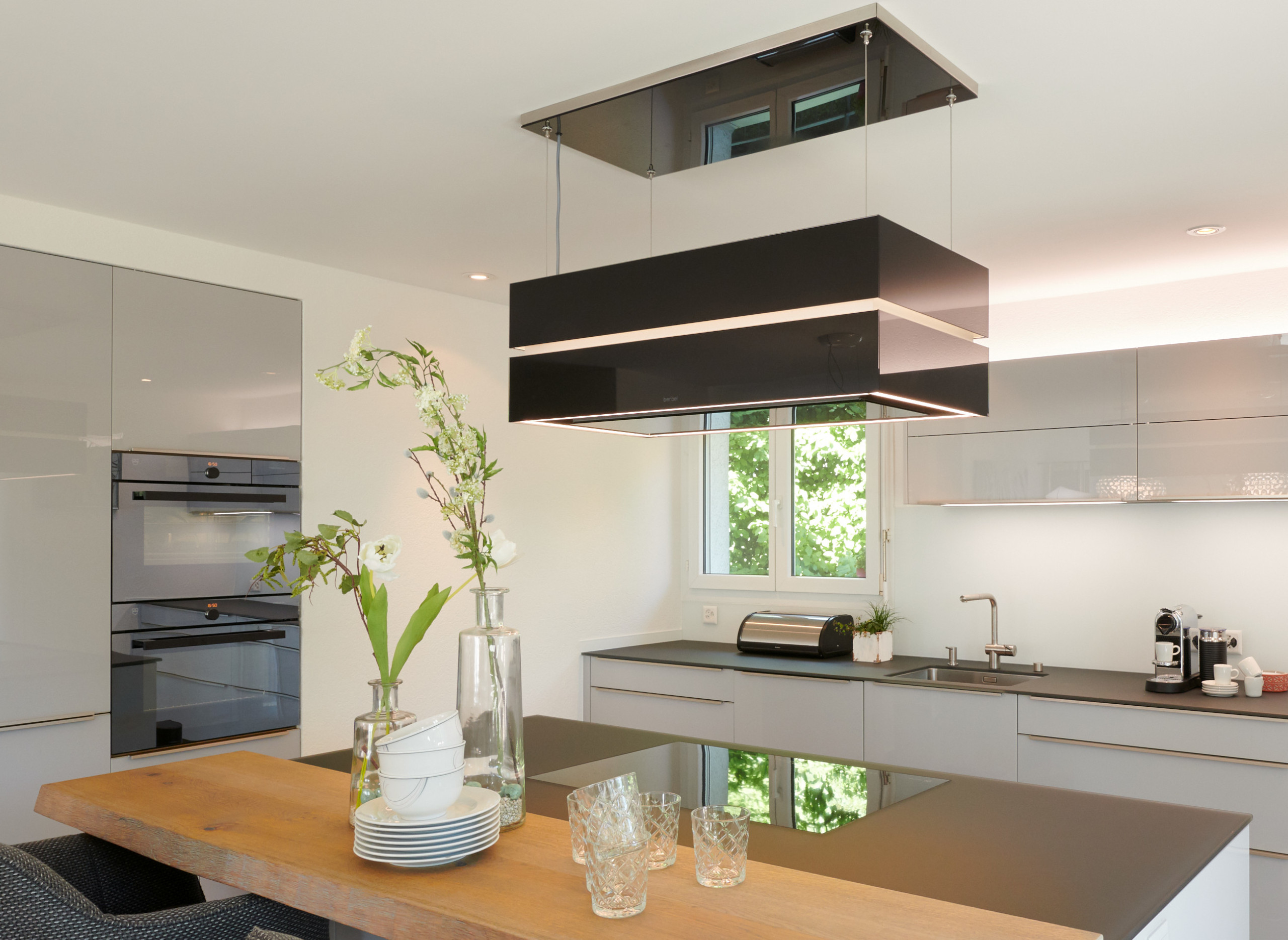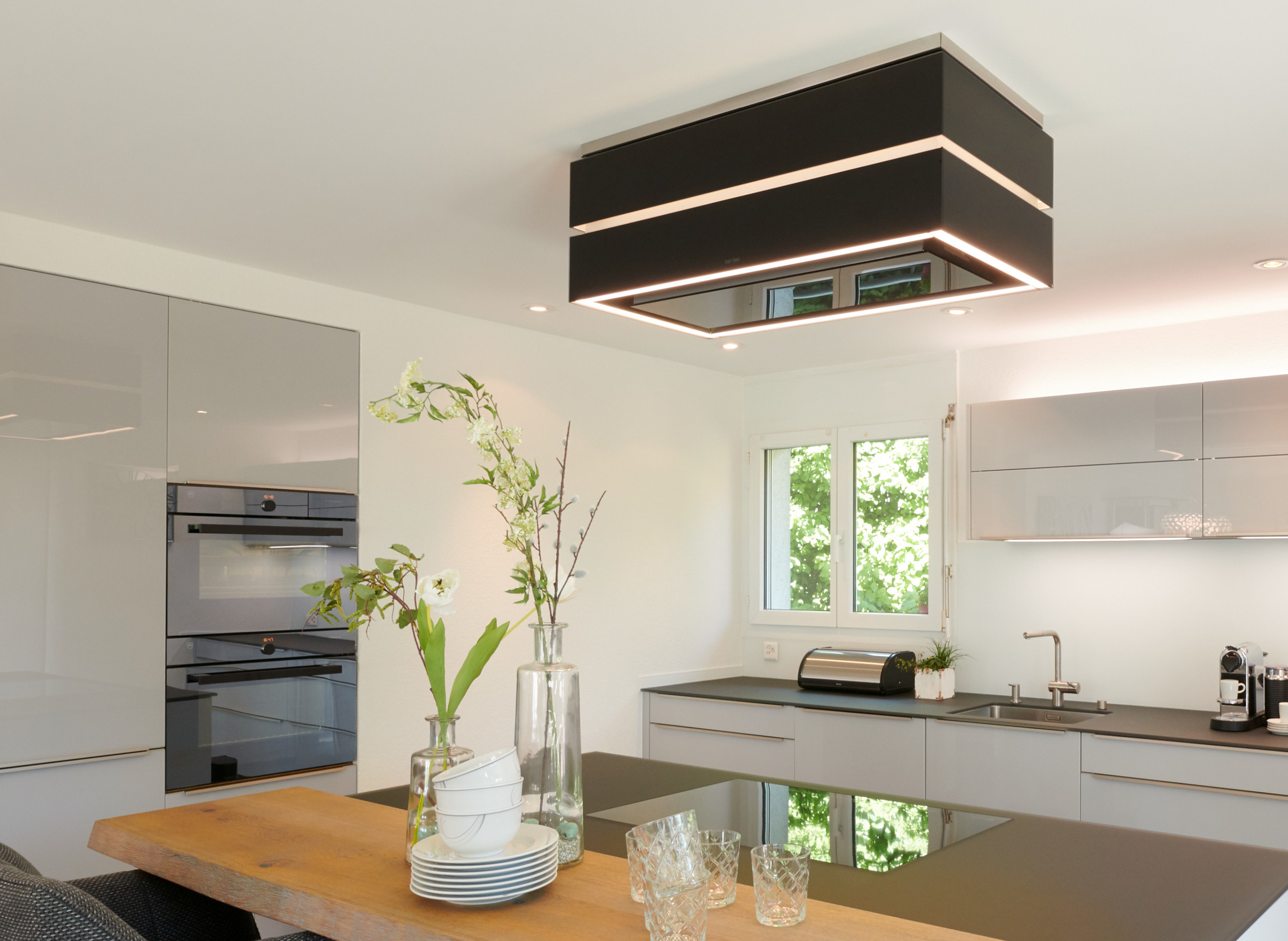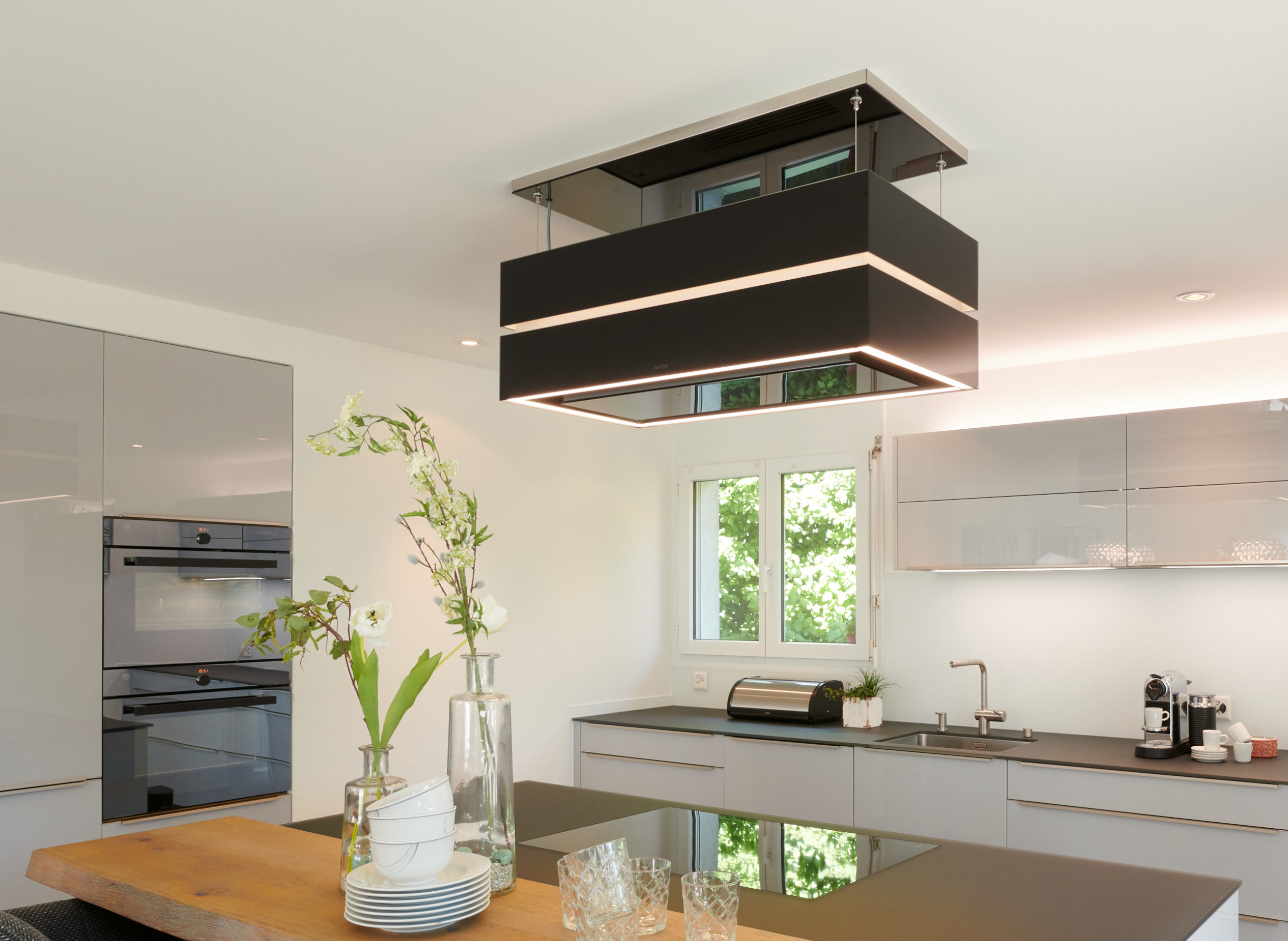 Die Inselhaube «Skyline Edge» setzt neue Maßstäbe im Kochkomfort. Dank der elektronischen Höhenverstellung passt sie sich perfekt den gewünschten Bedürfnissen an, während die Deckenplatte mit Glasverkleidung in Schwarz edle Akzente setzt.