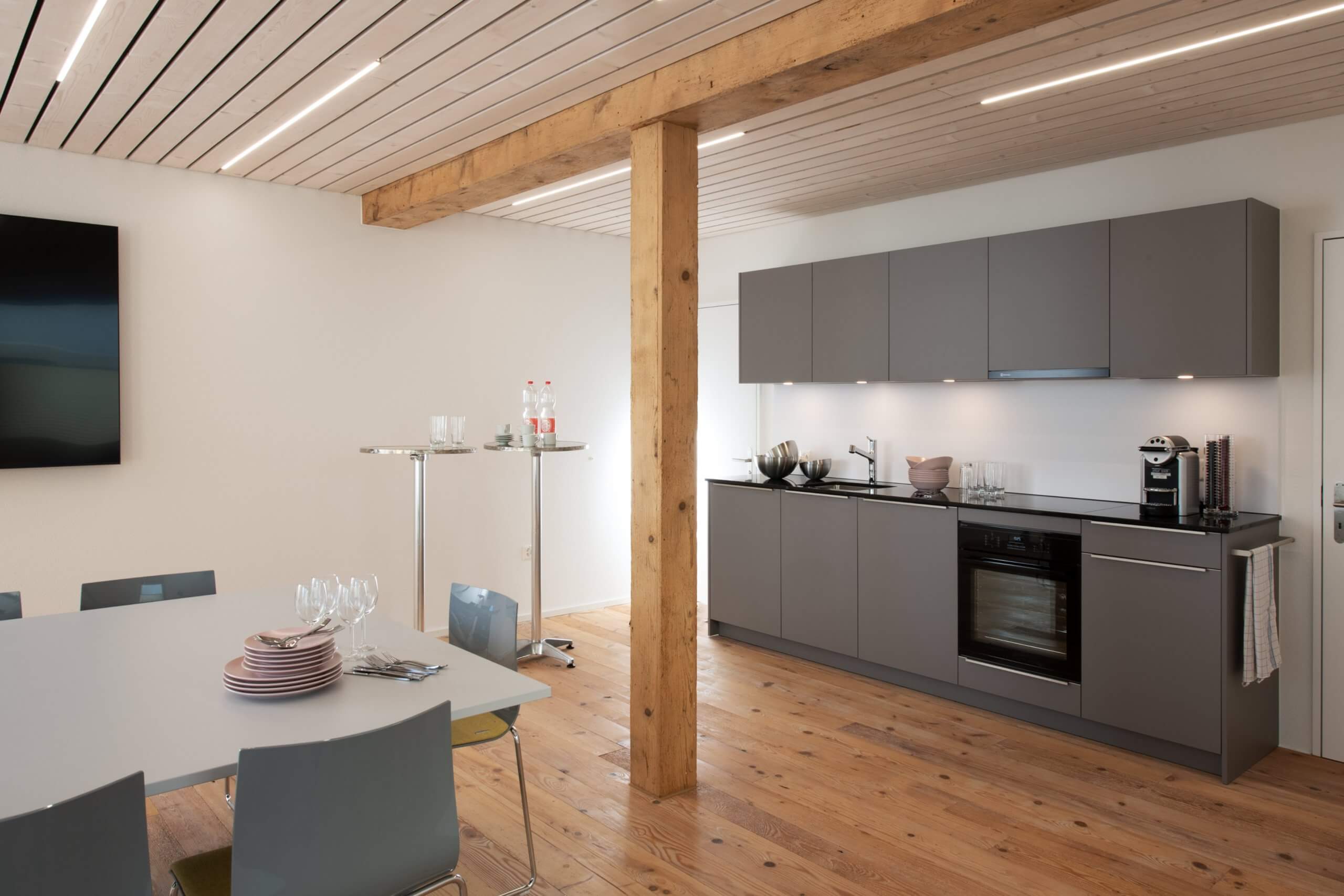 Zeitlos in Funktion und Form zeigt sich die Küche in warmen Grauton zwischen Altholzboden und weiss lasierter Deckenverkleidung. Dies sorgt für ein Sitzungszimmer in behaglicher Umgebung.