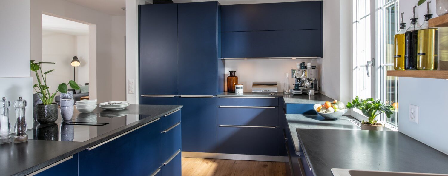 In der Mode ist Dunkelblau eine sehr beliebte Farbe – nun ist die Mode in den Küchenfronten.