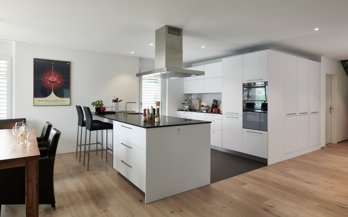 Die Einbauleuchten aus LED unterhalb der Oberschränke schaffen eine angenehme Ausleuchtung und schaffen die perfekte Atmosphäre. Die Aventos Faltklappen bieten eine elegante Lösung für den bequemen Zugriff auf Geschirr und Kochutensilien. Die Edelstahl-Elemente, wie das Becken, die Armatur und der Zugknopf, setzen stilvolle Akzente.