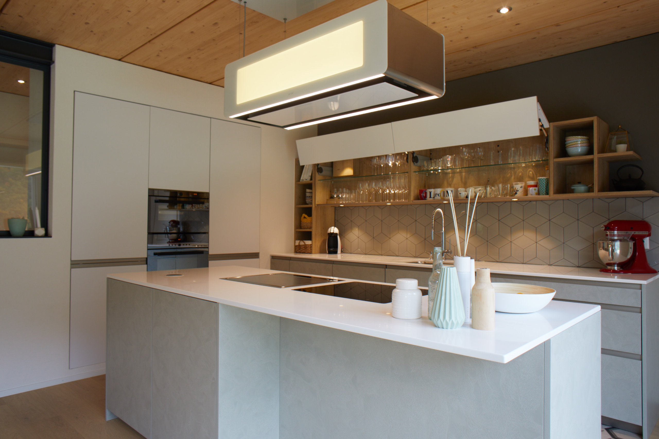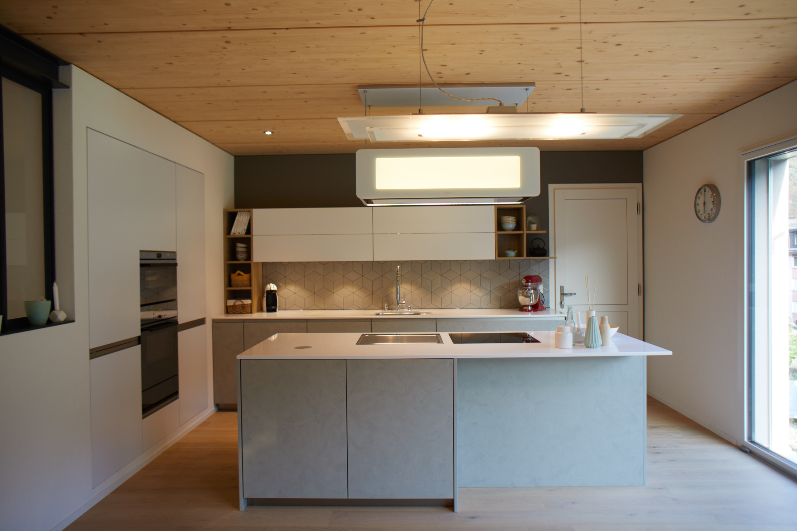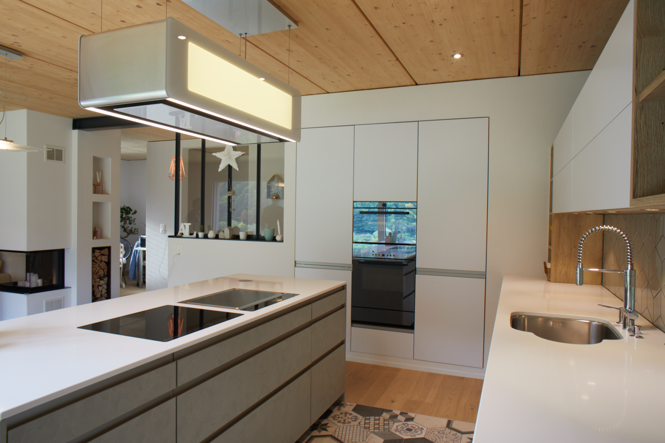 Integrierte Barlösungen sind nicht nur für den Aperitif gedacht, sondern auch für längere dauernde Küchen-Tätigkeiten. Die zurückhaltende Farbkombination und hohe Ergonomie zeichnen dieses Konzept aus. Weisse Fronten, im exakt auf die Arbeitsfläche abgestimmten Farbton, sowie ein auf die offenen Regale angepasstes Innenleben der Möbel, ergeben eine langlebige Durchgängigkeit. Als Kontrast wurden Fronten mit Beton-Oberflächen eingesetzt. Die gespachtelte Betonoberflächen erhalten durch die transparente Oberflächenversiegelung ihre Küchentauglichkeit. Die grifflose Gestaltung erzeugt eine unverwechselbare Optik und beton die Linienführung. Hängeschränke, welche auch im offenen Zustand nicht die Küchenabläufe stören, sind besonders praktisch. Beleuchtete Glastablare erzeugen eine angenehme Ambiance, die Küchenschränke sind offen fast schöner als geschlossen... I-Punkt ist der freihängende Dampfabzug welcher sich für den Gebrauch des Teppan-Yakki-Kochfeldes elektrisch absenken lässt.