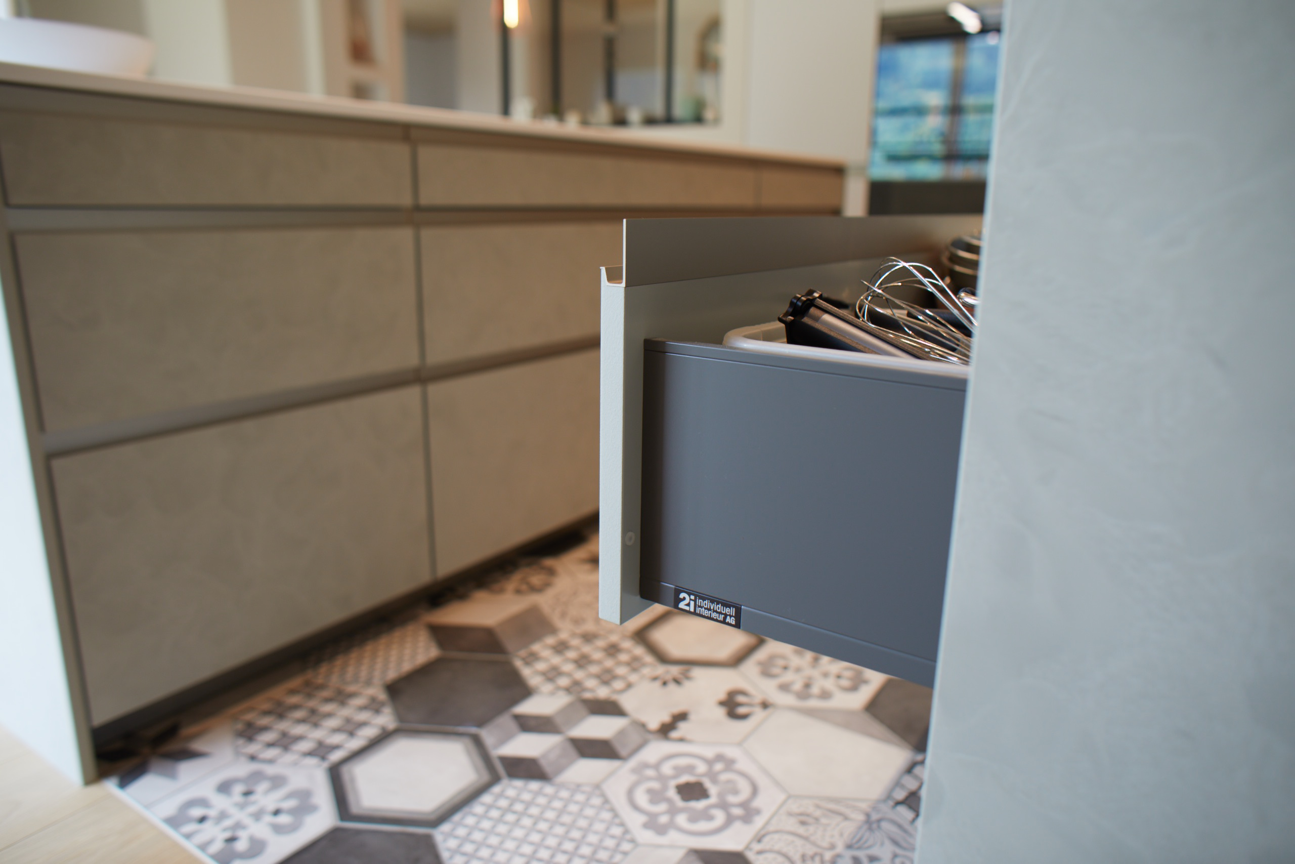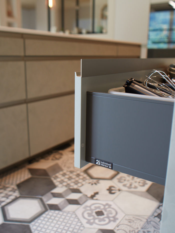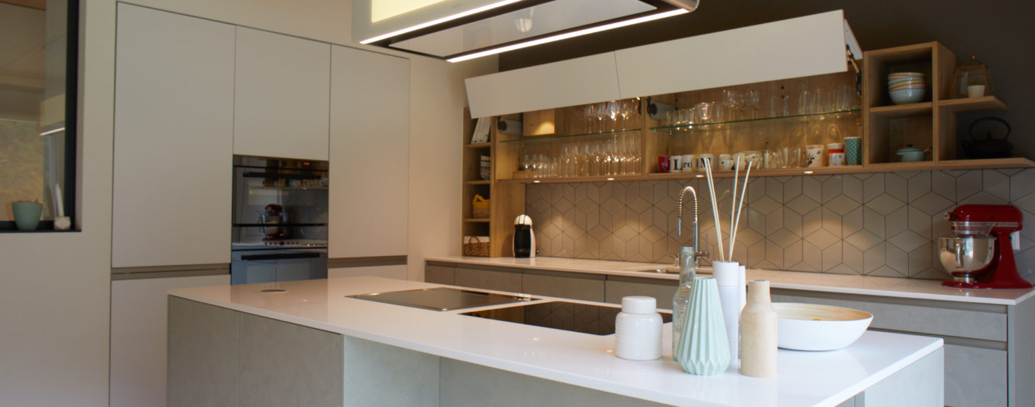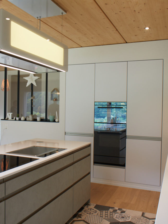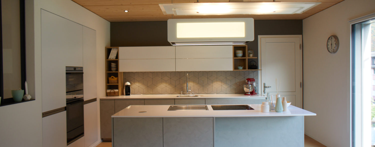 Integrierte Barlösungen sind nicht nur für den Aperitif gedacht, sondern auch für längere dauernde Küchen-Tätigkeiten. Die zurückhaltende Farbkombination und hohe Ergonomie zeichnen dieses Konzept aus. Weisse Fronten, im exakt auf die Arbeitsfläche abgestimmten Farbton, sowie ein auf die offenen Regale angepasstes Innenleben der Möbel, ergeben eine langlebige Durchgängigkeit. Als Kontrast wurden Fronten mit Beton-Oberflächen eingesetzt. Die gespachtelte Betonoberflächen erhalten durch die transparente Oberflächenversiegelung ihre Küchentauglichkeit. Die grifflose Gestaltung erzeugt eine unverwechselbare Optik und beton die Linienführung. Hängeschränke, welche auch im offenen Zustand nicht die Küchenabläufe stören, sind besonders praktisch. Beleuchtete Glastablare erzeugen eine angenehme Ambiance, die Küchenschränke sind offen fast schöner als geschlossen... I-Punkt ist der freihängende Dampfabzug welcher sich für den Gebrauch des Teppan-Yakki-Kochfeldes elektrisch absenken lässt.