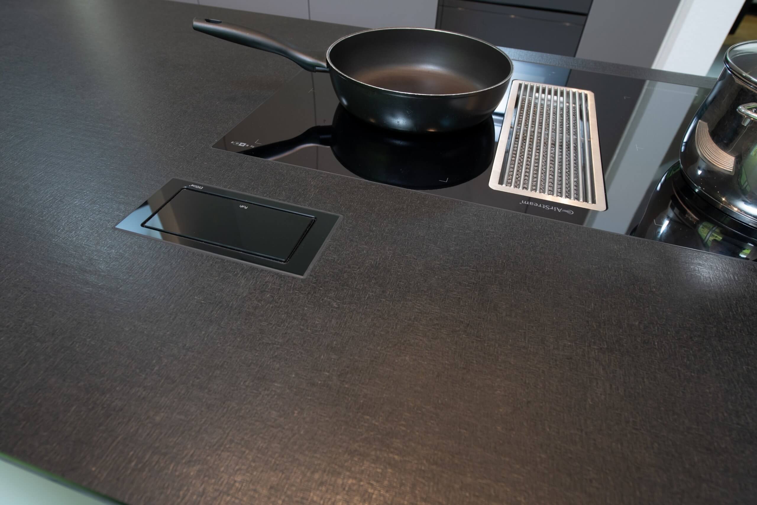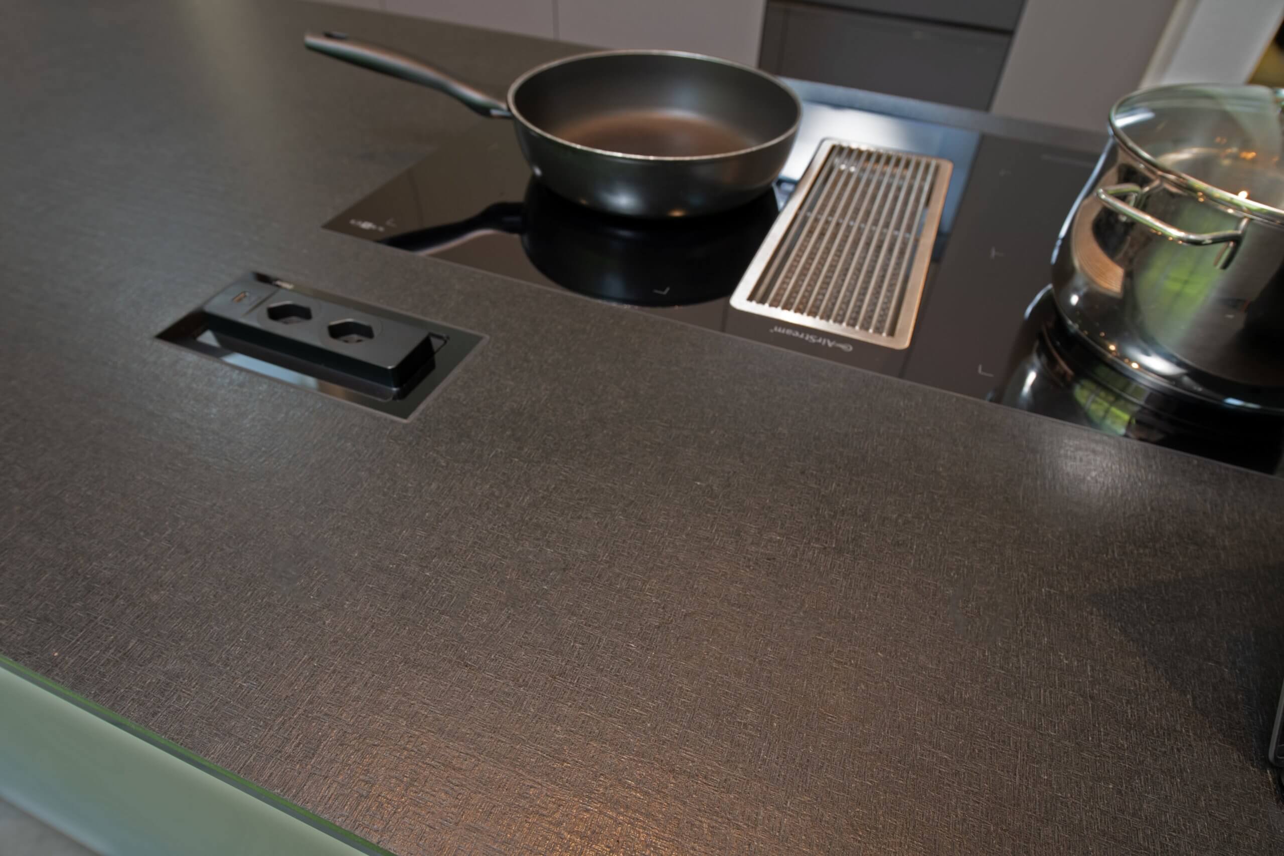 Der Motor des im Kochfeld integrierten Dampfabzugs befindet sich im darunterliegenden Keller. Dadurch verringert sich der Geräuschpegel deutlich. In der Naturstein-Arbeitsfläche bündig integriert befindet sich neben dem Edelstahlbecken und dem Kochfeld auch eine eingelassene Steckdose.