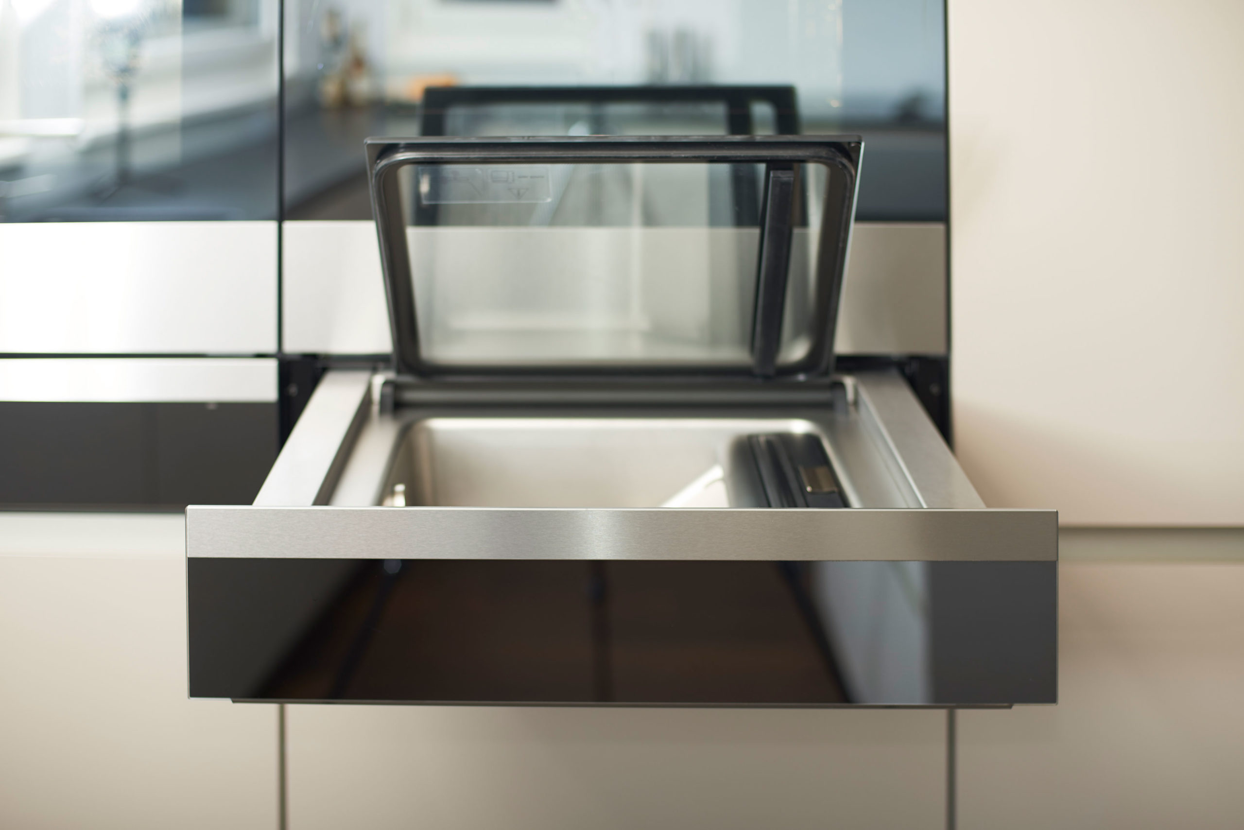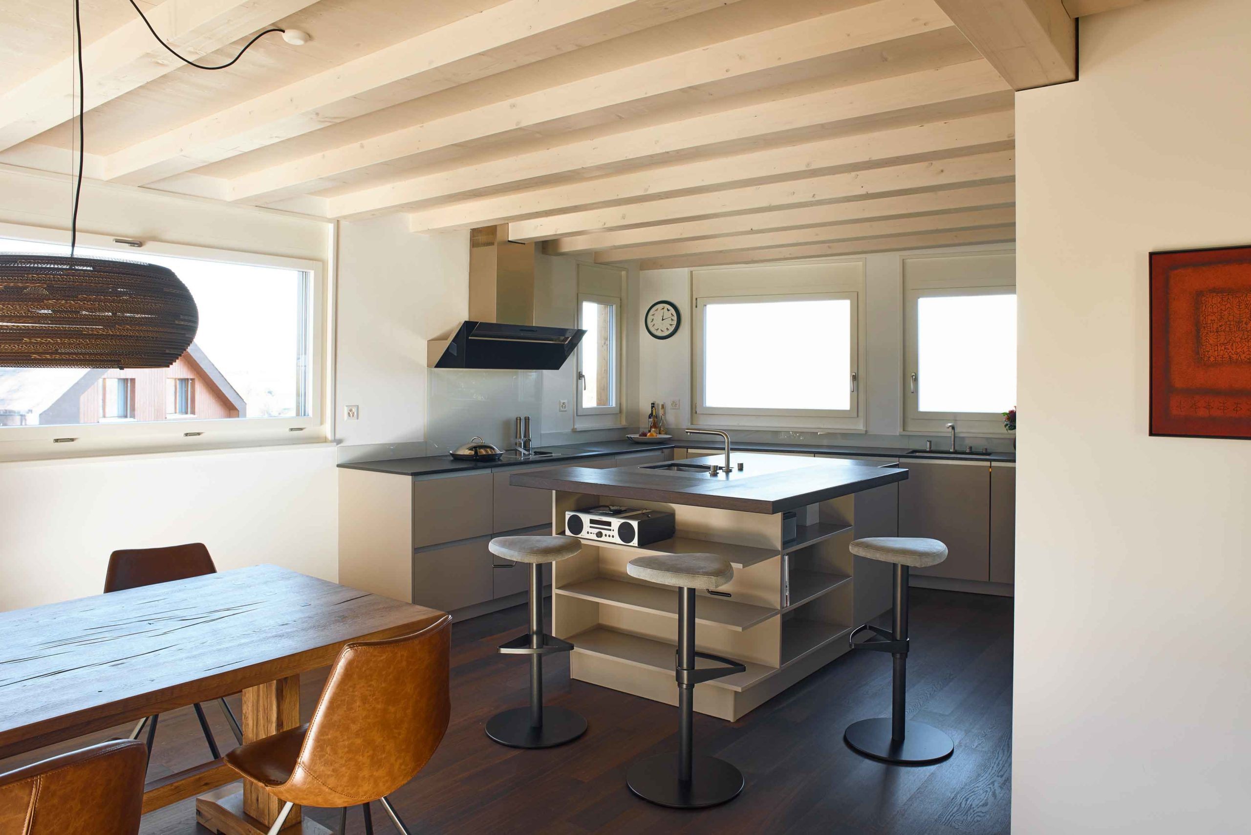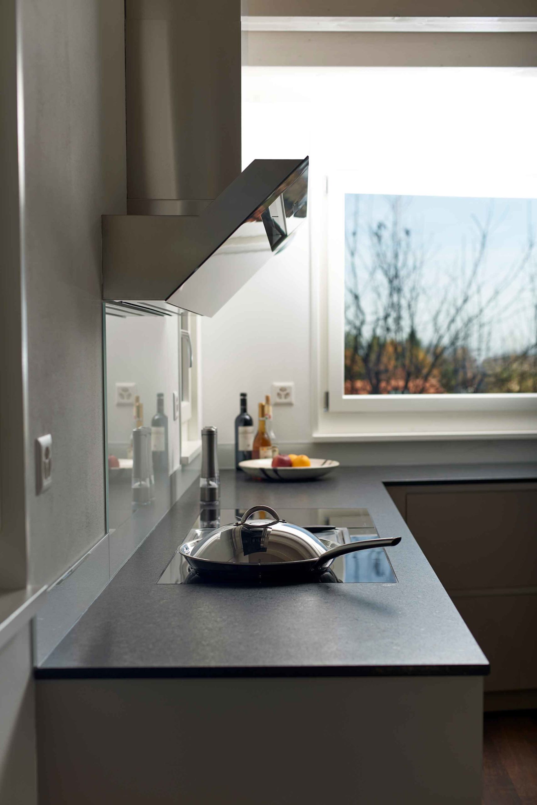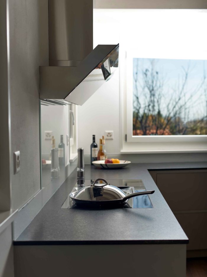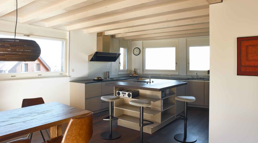 Hier treffen sich durchgängige Materialisierung, Farben und Formen. Unser Credo, die durchgängige Planung des gesamten Innenausbaus, inkl. Küche wurde hier kompromisslos umgesetzt. Küche, Wandschränke, Garderobe, Ankleide und Badmöbel sind aus den gleichen Materialien gefertigt und in der gleichen Farbgebung gehalten.