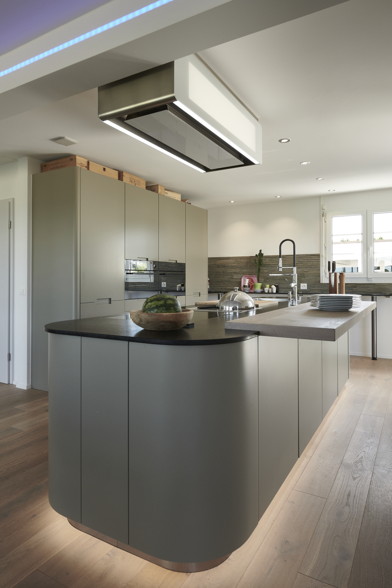 Dieses Küchenkonzept hat runde Abschlüsse, ist matt lackiert und verfügt über integrierte Griffmuscheln.Durch die runde Form sind die Durchgänge um die Kochinsel wesentlich grosszügiger. Dabei kann auch der Stauraum in den abgerundeten Möbeln praktisch und übersichtlich genutzt werden.