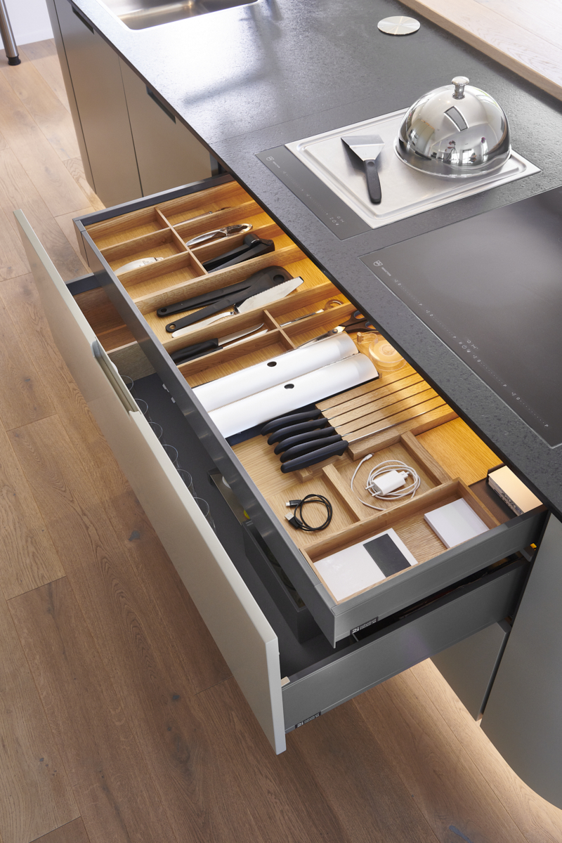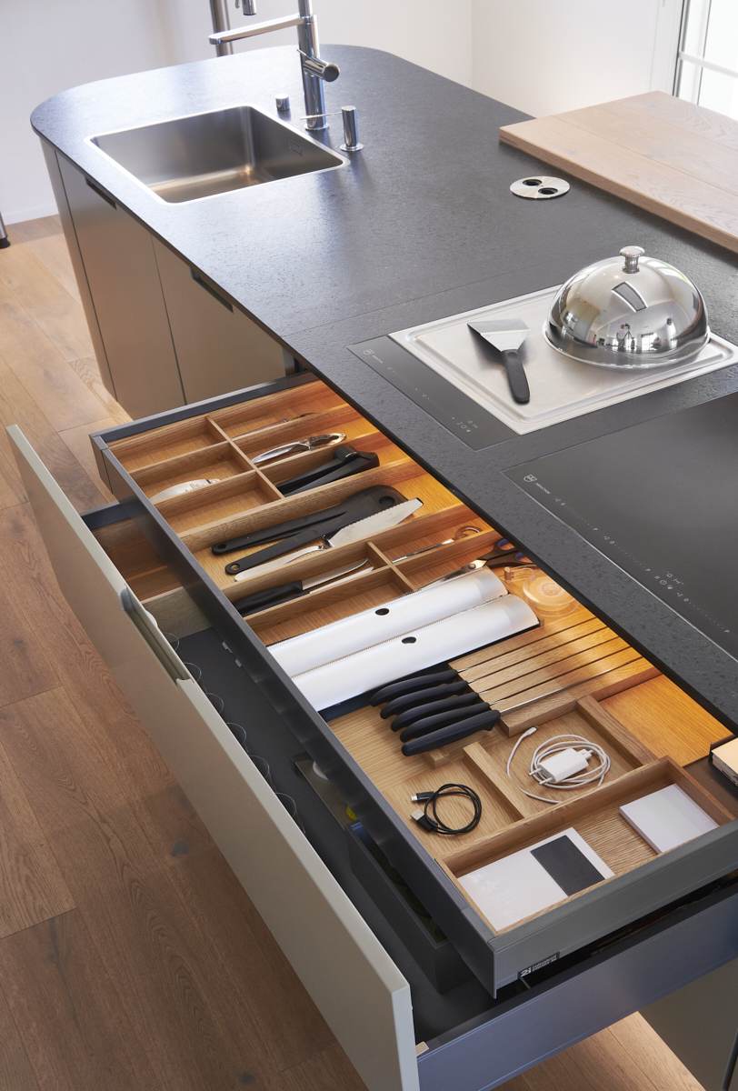Das Lichtkonzept wird in den Möbeln weitergeführt. Beim Öffnen der Auszüge schaltet sich automatisch die Innenbeleuchtung ein.