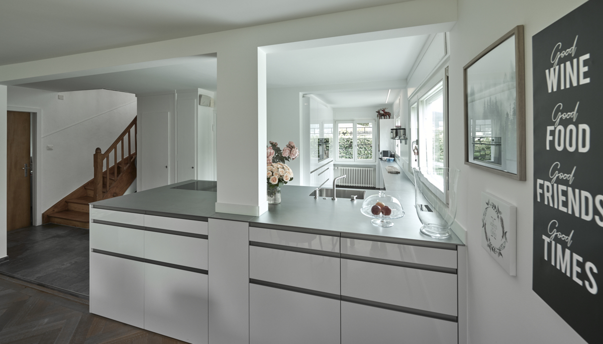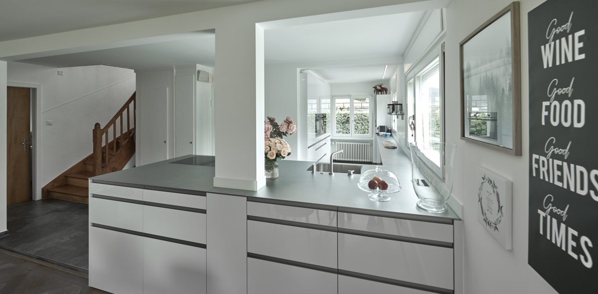 Das Küchenkonzept in mehrschichtigem Hochglanz Schleiflack ist in einem individuellen Weisston gehalten. Die Griffe sind front bündig eingelassen und garantieren komfortablen Zugriff und eine leichte Reinigung.