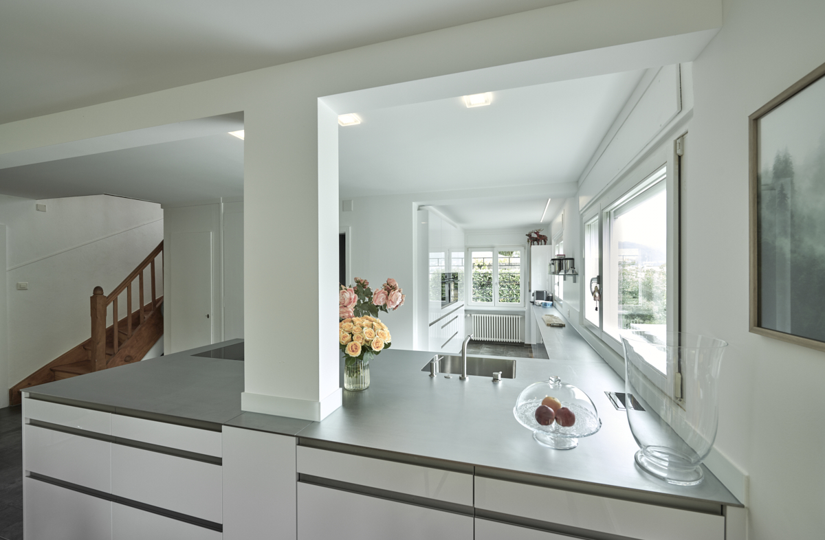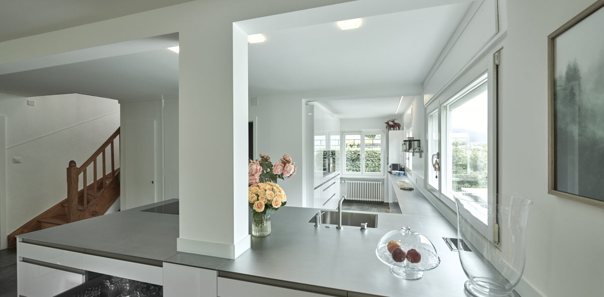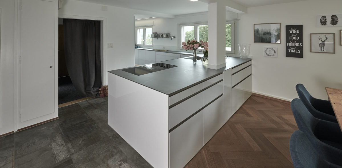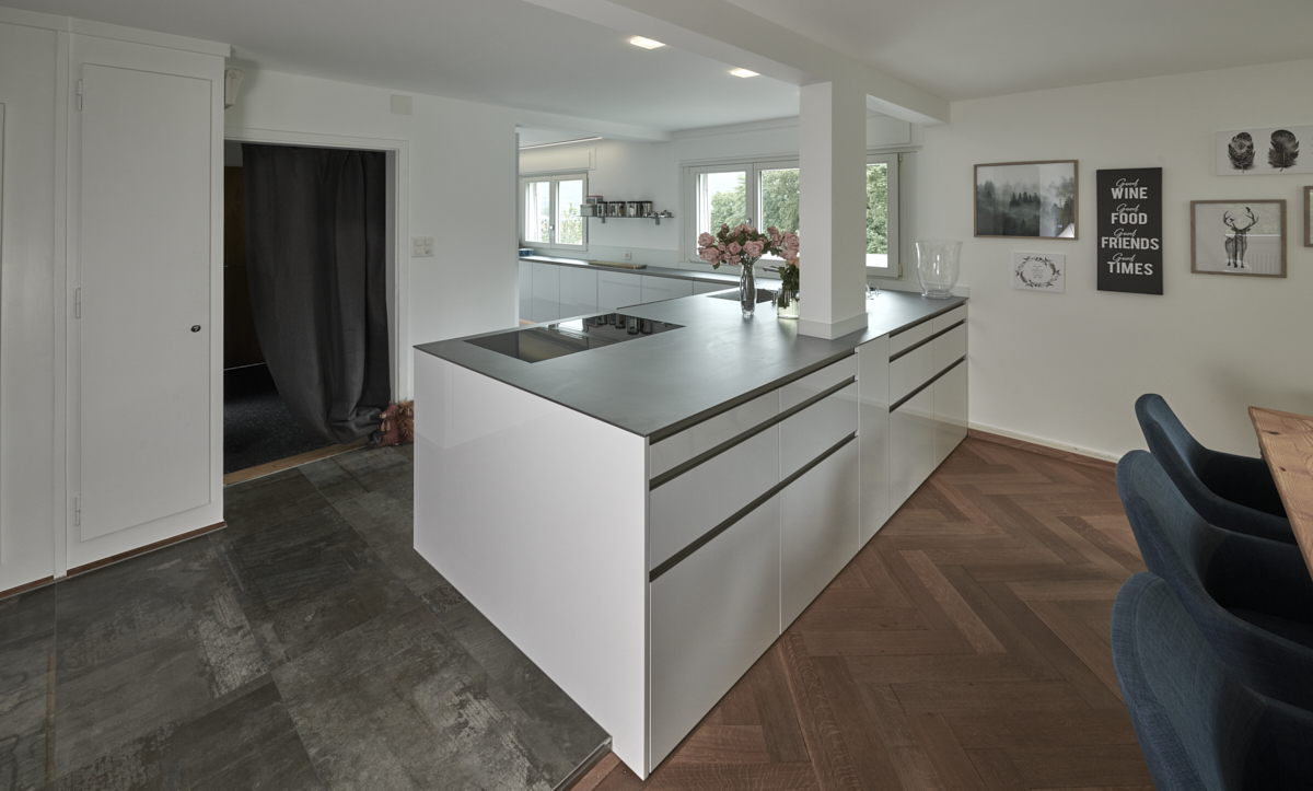 Die Insel verbindet zwei Niveaus an Fussboden. Durch bodenbündige Fronten wird der Absatz elegant verdeckt. So konnte der auserlesene Parkettboden erhalten und weitere Kosten vermieden werden.