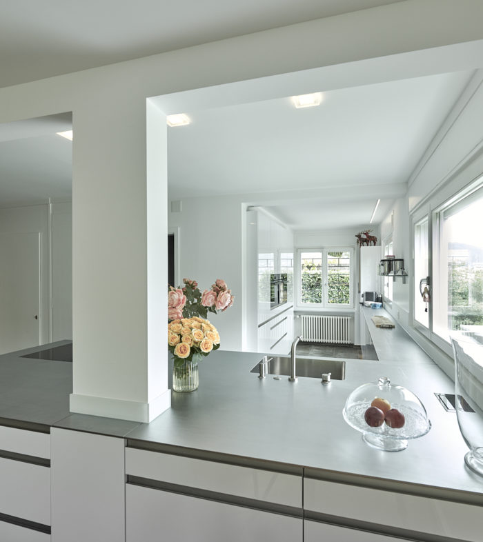 Die im Mauerwerk integrierte Wandschränke wirken elegant. Im Vorsprung wird die Zu- und Abluft für die verschiedenen Einbaugeräte integriert. Ebenso findet die indirekte Beleuchtung Platz.
