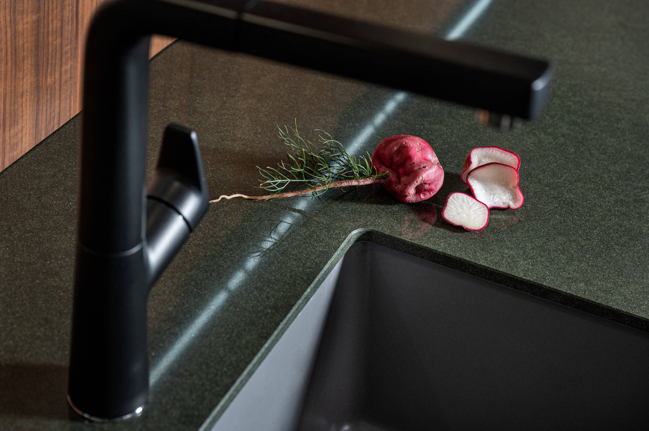 Innovatives Material: Die Arbeitsplatten bestehen zu 90 % aus zerkleinertem Naturstein und/oder Feldspat sowie zu 10 % aus hochwertigem Bindemittel. Dieses Zusammenspiel verleiht Ihrer Küche nicht nur eine edle Optik, sondern schont gleichzeitig wertvolle Ressourcen.